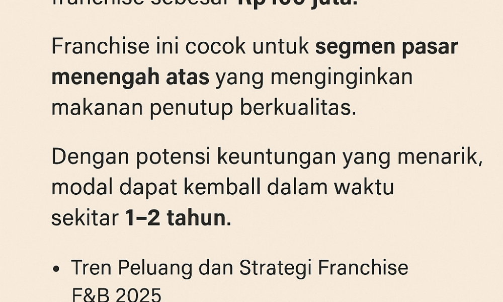 Harga franchise Beard Papa memang tergolong tinggi, namun sebanding dengan potensi keuntungan dan brand yang sudah mapan. Bagi pebisnis yang ingin menyasar segmen premium, camilan berkualitas, dan konsumen loyal, Beard Papa adalah pilihan yang menjanjikan. Dukungan sistem franchise, brand awareness yang kuat, serta tren F&B yang terus berkembang menjadi faktor utama kesuksesan bisnis ini.